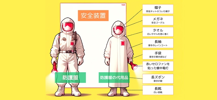 防護服はほとんどが白色ですが、駆除作業で使用する道具なども、黒色のものは避けた方が無難です。