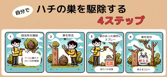 自分で蜂駆除を行うときには、次のような手順で行いましょう。