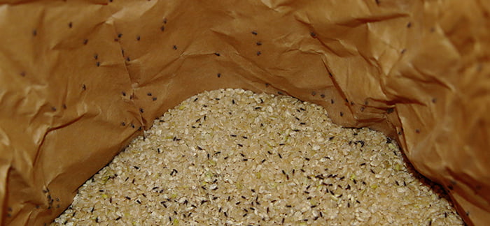 2つ目は、穀物を購入した後にコクゾウムシが家の中に侵入するケースです。コクゾウムシは嗅覚が敏感であり、穀物の香りを識別することができるため、家の中の穀物の匂いに引き寄せられて侵入し、米びつなどに入り込むことがあります。米などを購入して袋のまま保存している場合でも、袋を突き破って中に入ってくることがあるため、注意が必要です。