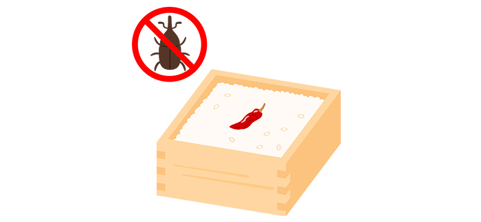コクゾウムシの被害を防ぐためには、唐辛子や防腐剤が有効です。昔から、お米を保管する際には乾燥したトウガラシを入れることで、虫の発生を防いできました。トウガラシに含まれるカプサイシンには、虫除け効果があります。米びつにトウガラシを入れる際は、米10kgに対して5本程度が適量です。ただし、トウガラシにヘタがついている場合はカビの原因となるため、ヘタを取り除いてから加えましょう。最近では、食品にも使用可能な害虫の増殖を抑えるタイプの虫よけも販売されています。虫よけを利用することで、コクゾウムシの繁殖を抑えることも可能です。