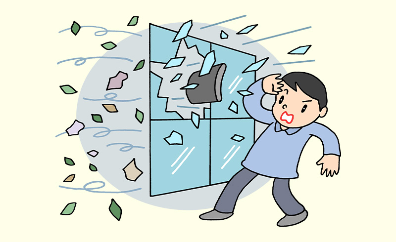 台風ほどの強風になると、看板が飛んでいってしまったり、屋根がはがれてしまったりして、窓ガラスにぶつかることがあります。