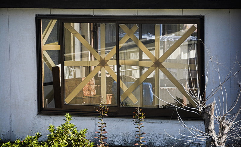 台風などでの対策としては、窓に「米の字」にガムテープを貼る方法があります。これは、ガラス飛散を抑えるためです。ダンボールを敷いた上に養生テープを使うと、剥がしやすく安全性が高まります。