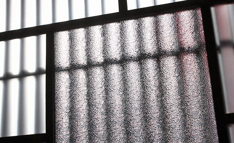 型板ガラスは、片面のみ表面に細かな凹凸の加工が施されているガラスのことです。 すりガラスと同様に、光を取り入れることができて、向こう側がはっきり見えません。 しかし、水に濡れても、向こう側は見えないという点ですりガラスと異なります。 浴室のドアなどに向いているでしょう。
