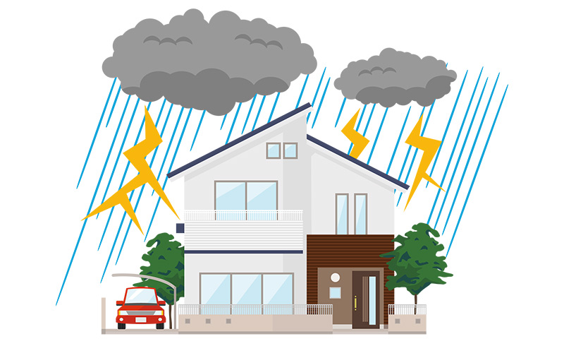 雷は鉄塔や高い建物に落ちるため、戸建住宅に落ちることは少ないです。