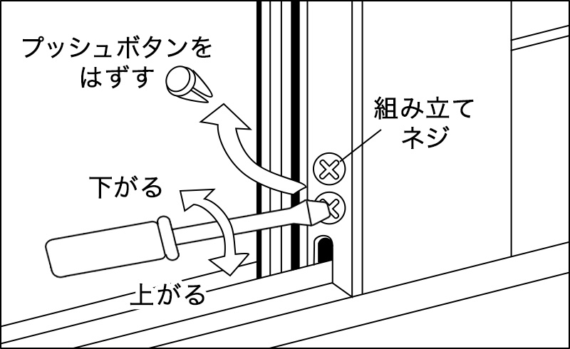 2.サッシ戸の側面下にあるプッシュボタンがあれば取り外し、奥の調整ネジで高さを調整し、右回りでサッシを上げ、左回りで下げます。