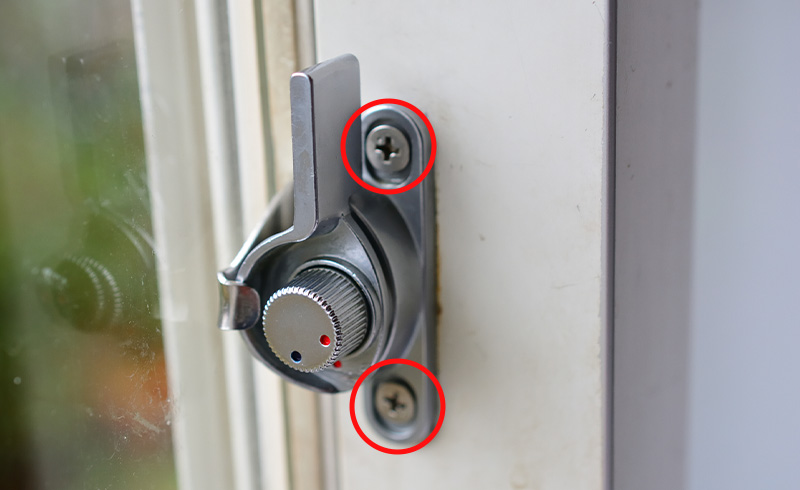 まず、窓がきちんと閉まっているか確認しましょう。次に、クレセント錠の位置を調整します。これは、鍵の上部と下部のカバーを外し、ネジを緩めて適切な位置に動かした後、ネジ(下の画像の赤丸)を締めることで行います。