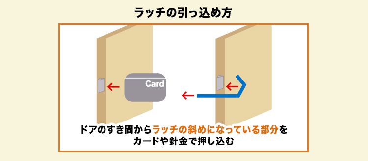 ラッチとは、ドアの側面にある部品のことで、このラッチがゆがんだり、錆びついたり内部が劣化すると、ドアノブを回してもラッチが締まらず、ドアは開かなくなります。このような状況では、キャッシュカードや物差し、針金ハンガーなどの薄くて硬いものを使って、直接ラッチを引っ込めることでドアを開けることができる可能性があります。