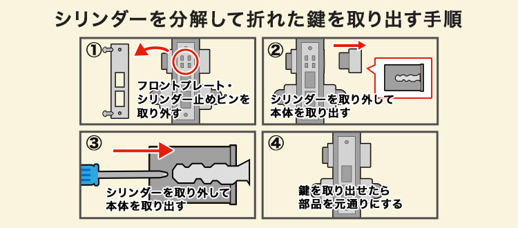 扉が開いた状態であれば、シリンダー(円筒の錠前部分)を、ドア側面から取り出すこともできます。シリンダーを分解して反対側から折れた鍵を押し出す方法です。ただし、シリンダーの分解は、これまで紹介した以上に難易度の高い作業です。分解後は元通りにしないと、鍵が使えなくなるので、安易に手を出さない方がいいでしょう。