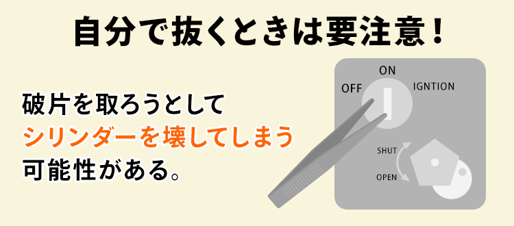 しかし、シリンダーを傷つけずに慎重に作業する必要があります。無理に引き抜くとシリンダーを壊してしまい、修理費がかさむことがあるため注意が必要です。自分での取り除きは推奨されず、鍵屋に依頼するのが確実です。自己責任で試みる場合は、細心の注意を払ってください。