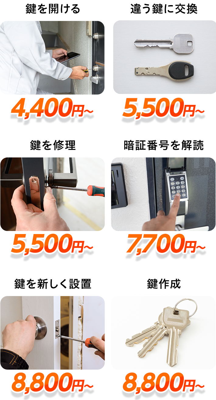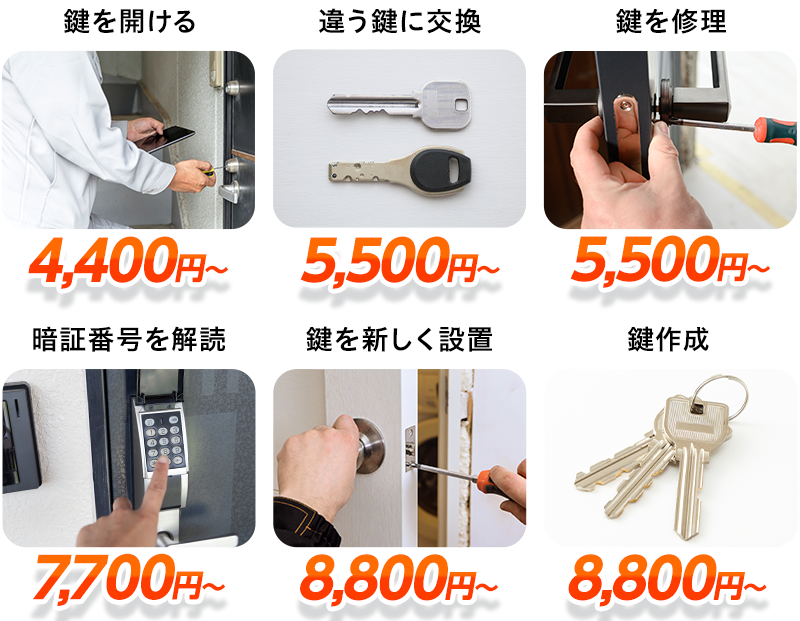 作業は4,400円~鍵の種類や 修理内容によって数十万円する作業もあります。